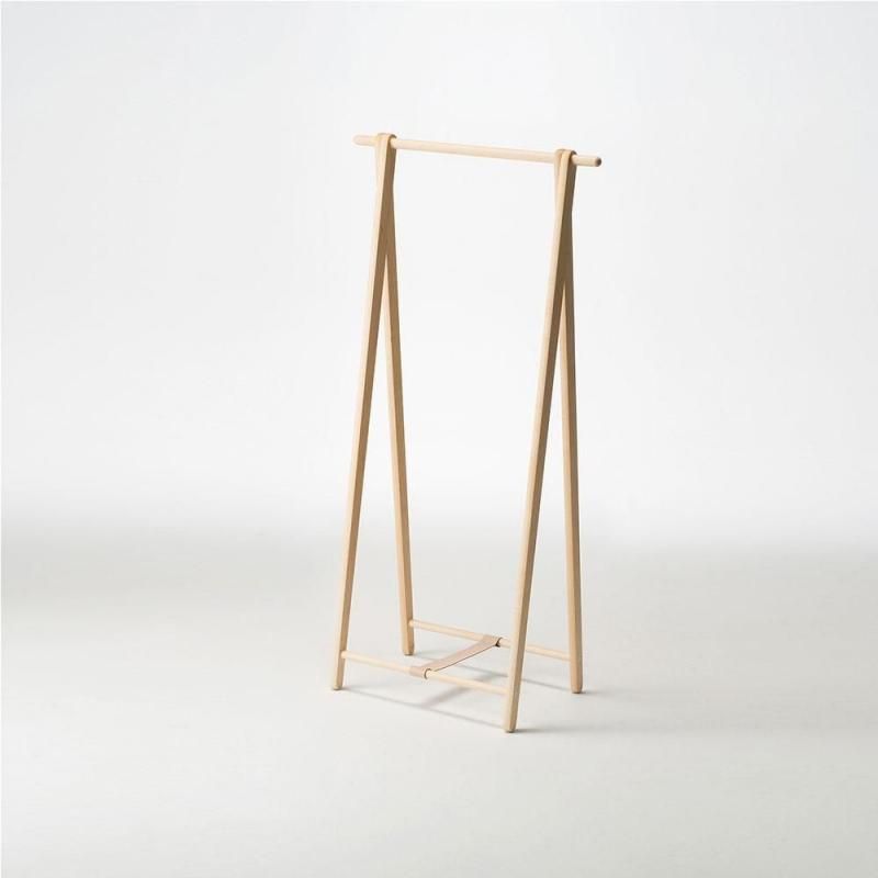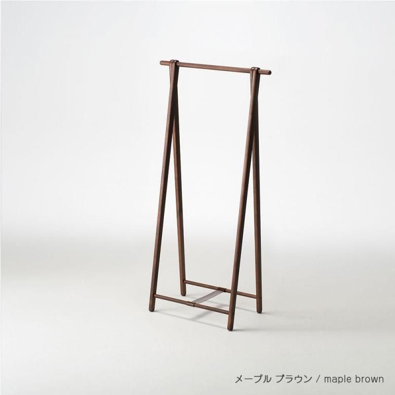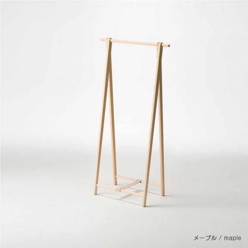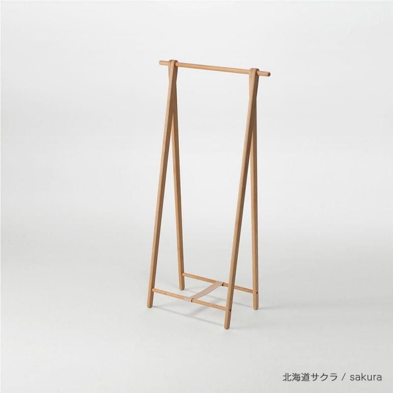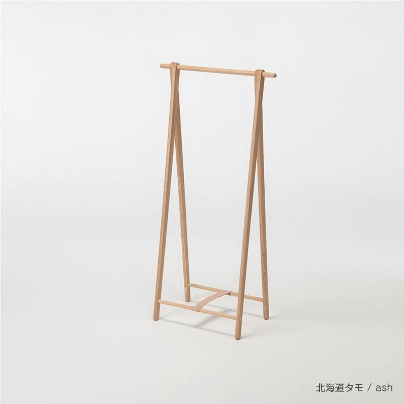 脚の緩やかなかまぼこ面や丁寧に仕上げた丸棒はドレスラック全体の印象を和らげ、手に触れたときにも優しい感触です。脚下の丸棒に渡す革ベルトも全体の印象に調和するナチュラルな色と質感のものを選びました。