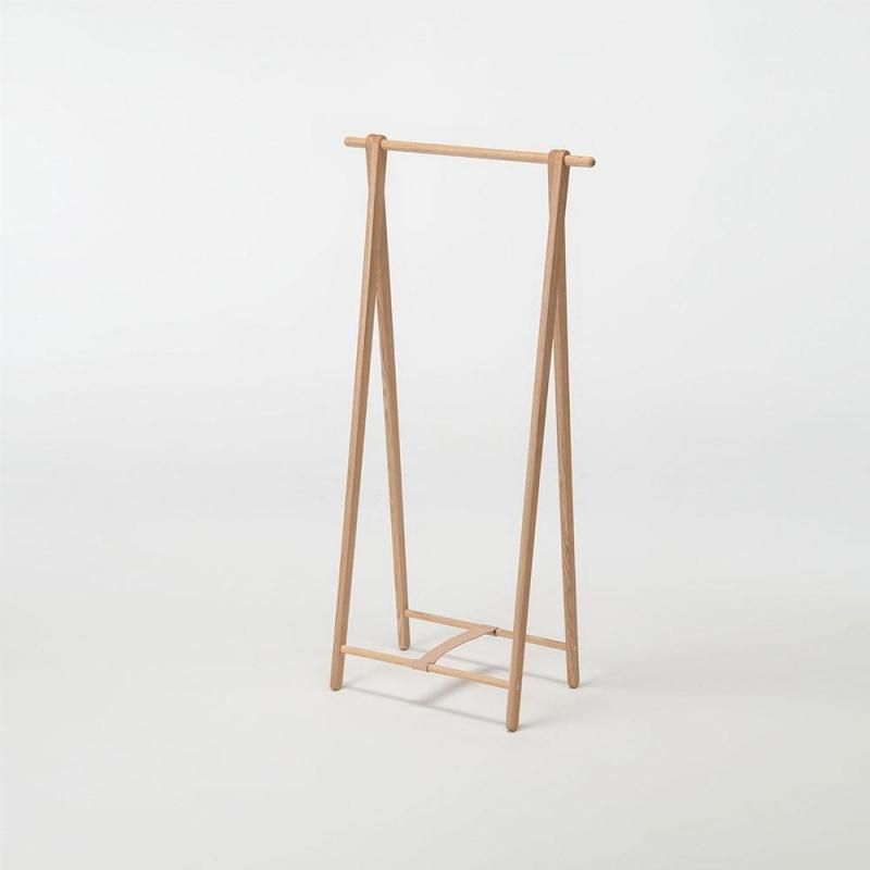 様々なテイストに調和するシンプルデザインでありながら、どこか自分らしい空間を作ってくれる意匠と素材感が魅力。ドレスラックと同様の脚の緩やかなかまぼこ面や丁寧に仕上げた丸棒は全体の印象を和らげ、手に触れたときにも優しい感触です。脚下の丸棒に渡す革ベルトも全体の印象に調和するナチュラルな色と質感のものを選びました。