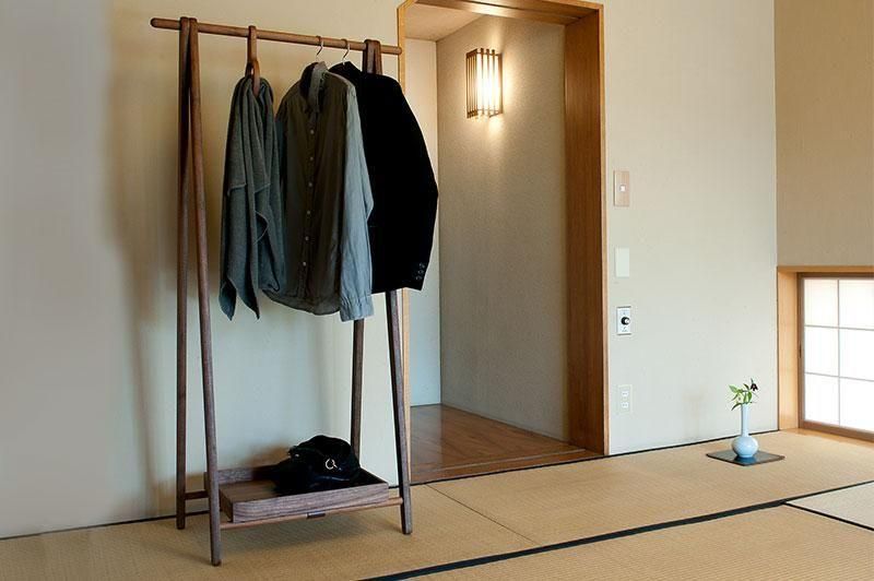 コサインのハンガーで17着ほど掛けられる収納力と、たたんで移動できる身軽さ、どこに置いてもシンプルで飽きのこない美しいデザインと素材感が特徴です。
