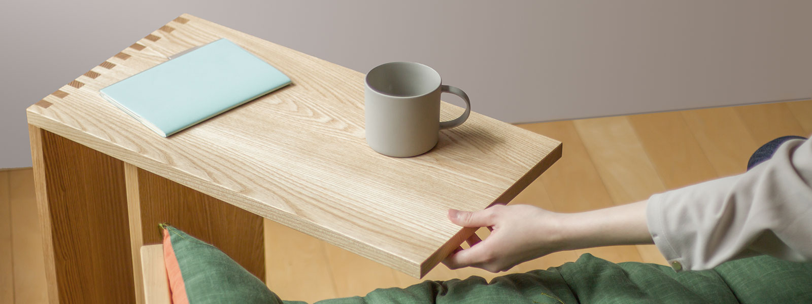 ソファやベンチの座に差し込んで手元まで引き寄せて使えるテーブルです。仕切り板があるので、本や雑誌を収納できます。