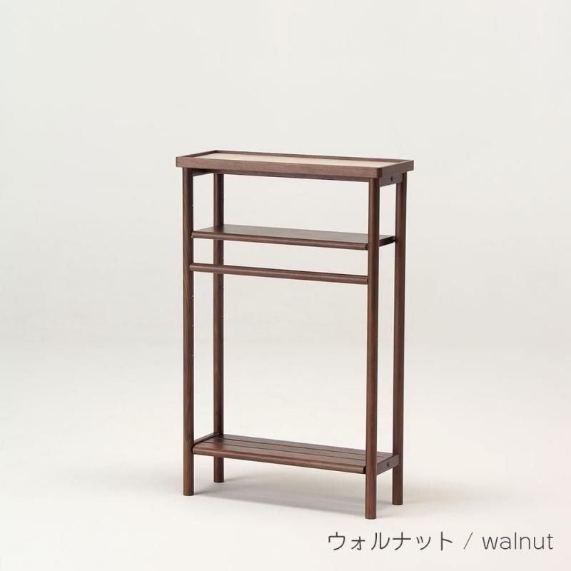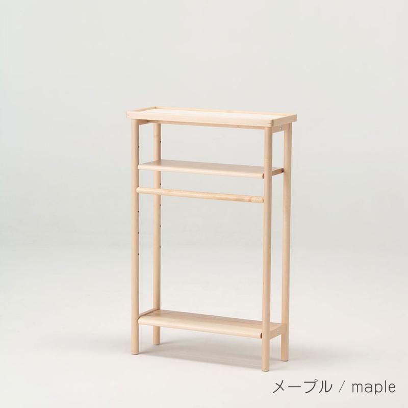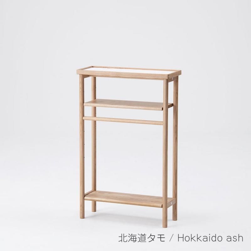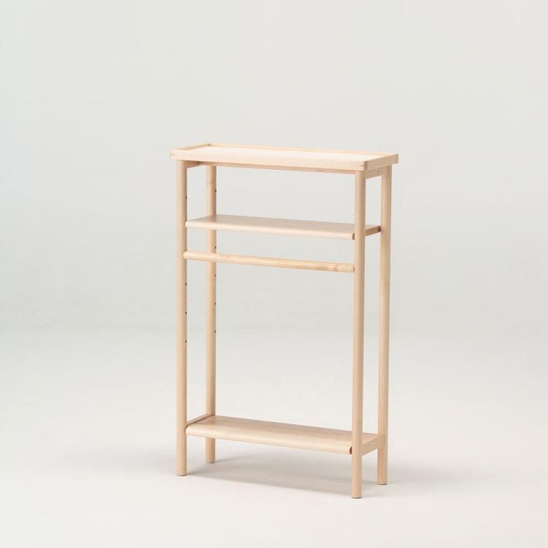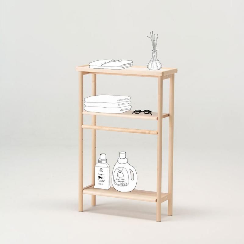 立ち上がりの付いた天板には、お風呂に入る際に必要なタオルや着替え、眼鏡などの小物類を置くのにぴったり。可動式の棚板と丸棒のタオルバーは、6段階の高さから自由な位置に取り付けることが可能で、タオルバーには幅45cm程度のバスマットを広げたまま掛けることができます。